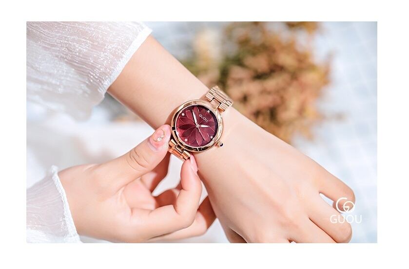 GUOU 腕時計 時計 レディース 女性用 ウォッチ セレブ 人気 クリスタル アクセサリー ラッピング無料 かわいい おしゃれ ピンクゴールド ブレスレット 旅行 イベント カジュアル 通勤 通学 丸形 花柄 3D 6006